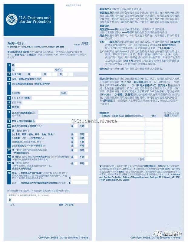 4、在飞机上空乘人员会发一张海关申报单,中英文均有。不会英文者可填写中文版(I-94表格不需要填)。